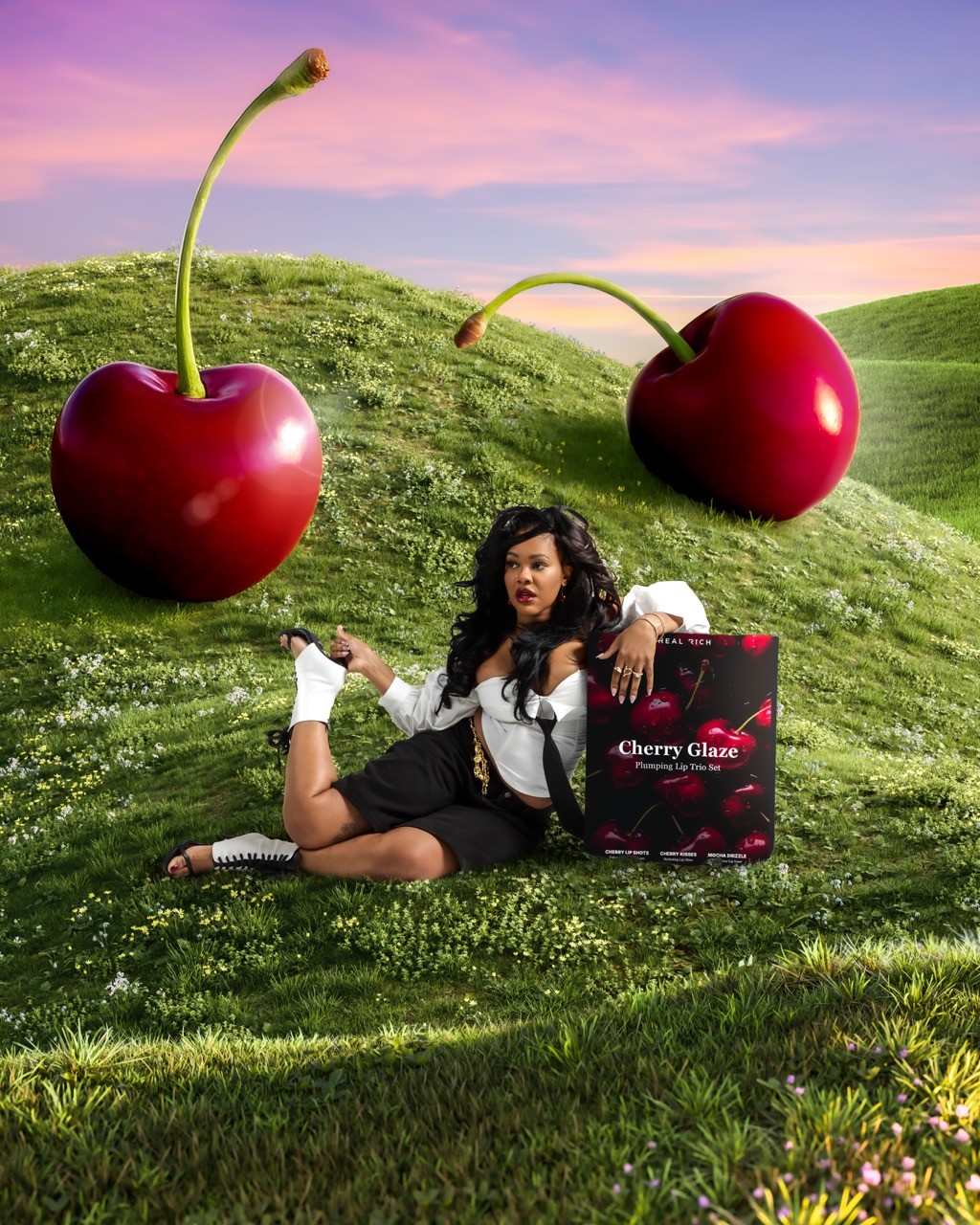 For this project, the visual palette centered around dark reds, so I led the concept toward a surreal outdoor scene built around oversized cherries. Starting from the original studio photography, I developed the idea of placing her in an open field and executed the full environment from there, blending the subject into a stylized landscape while keeping the product front and center. The focus was on creating a bold, playful contrast between scale and realism, using the cherries as visual anchors to reinforce the flavor story while maintaining a polished, commercial feel. I handled the compositing, lighting balance, color direction, and overall atmosphere to make the scene feel cohesive and intentional, turning a simple portrait into a vibrant, fantasy-inspired product moment.
